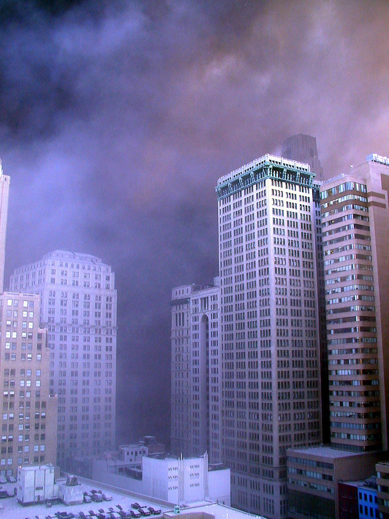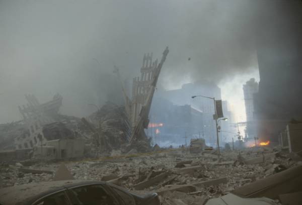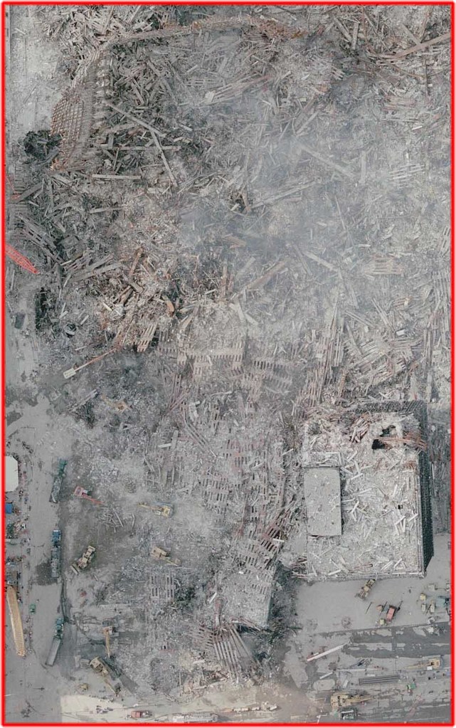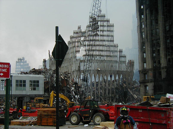 Figure 87(d). On the afternoon of 9/11/01 the "rubble pile" left from WTC1 is essentially non-existent. WTC7 can be seen in the distance, revealing the photo was taken before 5:20 PM that day. |