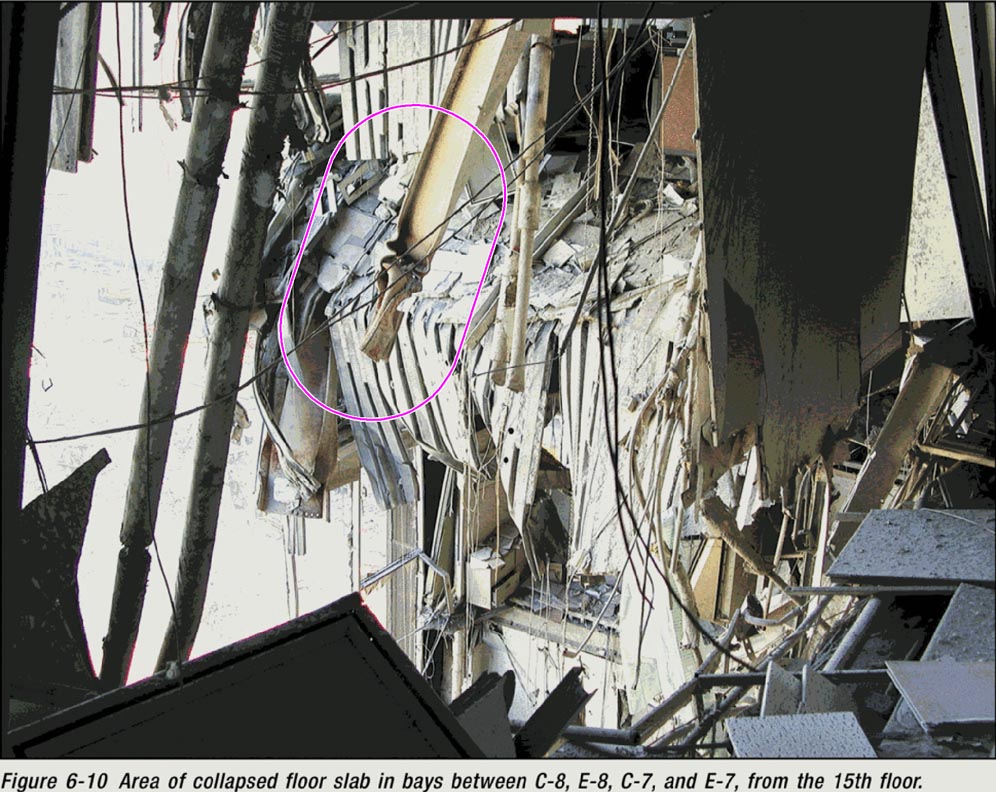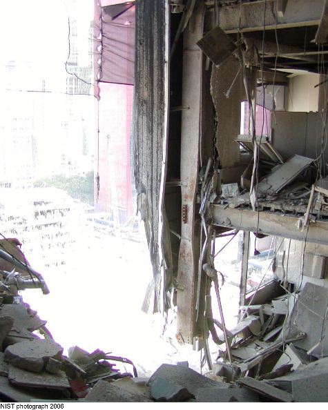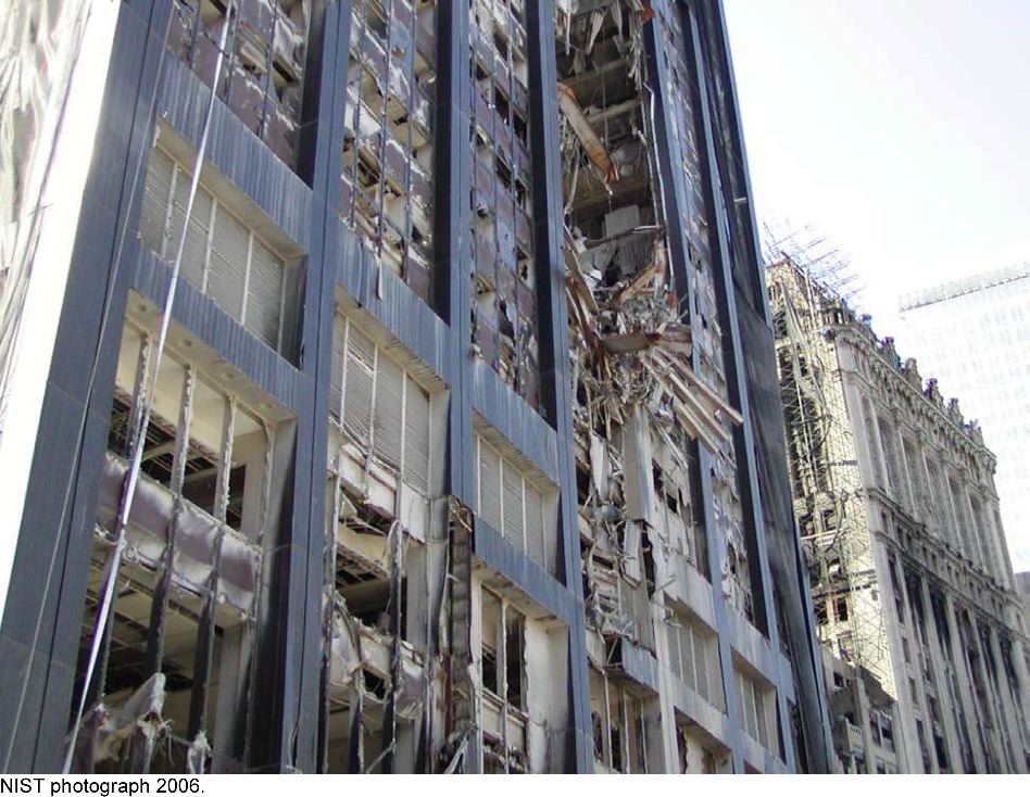 The Bankers Trust building at 130 Liberty Street, also referred to as the Deutsche Bank building, withstood die impact of one or more pieces of column-tree debris raining down from the collapsing south tower (WTC 2). Although the debris sliced through the exterior façade, fracturing spandrel beam connections and exterior columns for a height of approximately 15 stories, the building sustained only localized damage in the immediate path ofthe debris from WTC 2 (hereafter referred to as the impact debris) (Figures 6-1 and 6-2). There were no fires in this building. [emphasis added] The ability of this building to sustain significant structural damage yet arrest the progression of collapse is worthy of thorough study. Unlike WTC 1, 2, and 7, which collapsed completely, the Bankers Trust building provided an opportunity to analyze a structure that suffered a moderate level of damage, to explain the structural behavior, and to verify the analytical methods used. The following sections describe the building structure, the extent of damage, and the computational methods that were used to analyze the structure.