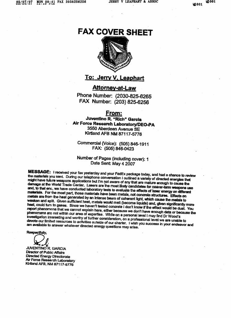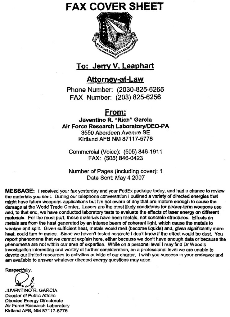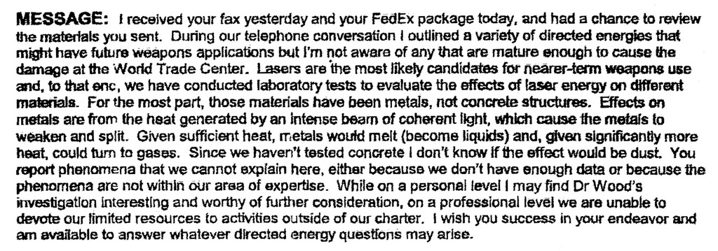 DEW Information follow-up letter to response from the Office of Public Affairs, Directed Energy Supplement#2 to RFC submitted earlier (320 kb) DEW Information Request Letter, with comments MEMORANDUM To: Dr. Judy Wood (232 kb) Supplement#1 to RFC submitted earlier (28 kb) RFC: What Happened was Not Inevitable (6.5 Mb) (Other pdf resolutions available here.) |