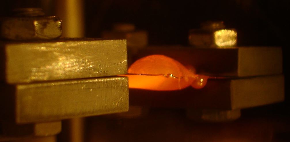 This is the same image I have in a video clip. The dark spot at the top looks silver and dances around like it's boiling. You may notice the darkened appearance around the copper block that clamps the end. That's what I refer to as the high-pressure "evaporation." What you see is from these experiments alone. Notice that the drip hanging below (near the right end of the boat) is glowing, yet has a more silver color than the "bread loaf." Here is where we abruptly turned down the current, cooling the tungsten boat. The aluminum is still glowing. Note that the drip on the under side, near right end, looks silver. I believe it looks silver at a slightly lower temperature than the red glow, although it is (just barely) melted. In full atmospheric pressure, I think the surface may be more likely to look silver (a) because of the temperature loss adjacent to the surface, and (b) there may be some reaction with the air, just on the surface. But that would only be an issue at the "just-barely-glowing temperatures. The "rising loaf of bread" appearance is interesting. This is caused by the low-pressure environment, but may exist in atmospheric pressure, too, as the result of high surface tension. Other examples of glowing molten aluminum.