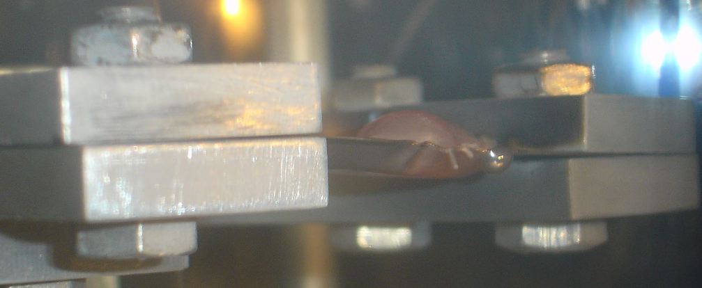 Here, the Aluminum wire is beginning to bend over the edge. It may not be obvious, but the boat is just beginning to glow. The aluminum looks a little more shiny. Notice that the aluminum has melted, or is about to melt, and still appears silver. It looks like it dripped over the edge, but that's just where the wire drooped over the edge. The thick piece of wire that is hanging straight down looks more shiny than it did before it was heated. This is true for all of the aluminum. After melting, the aluminum forms a ball. (It looks like a rising loaf of bread!) Notice that the drip hanging below (near the right end of the boat) is glowing, yet has a more silver color than the "bread loaf." Notice the drip on the under side, hanging down. The surface tension seems to be fairly high. Notice that the drip hanging below (near the right end of the boat) is glowing, yet has a more silver color than the "bread loaf," indicating that it is slightly cooler than the aluminum on the other side. Also, the tungsten boat this drop is hanging from is a dark red. Let's consider the evidence. Turn on a standard 60-Watt incandescent