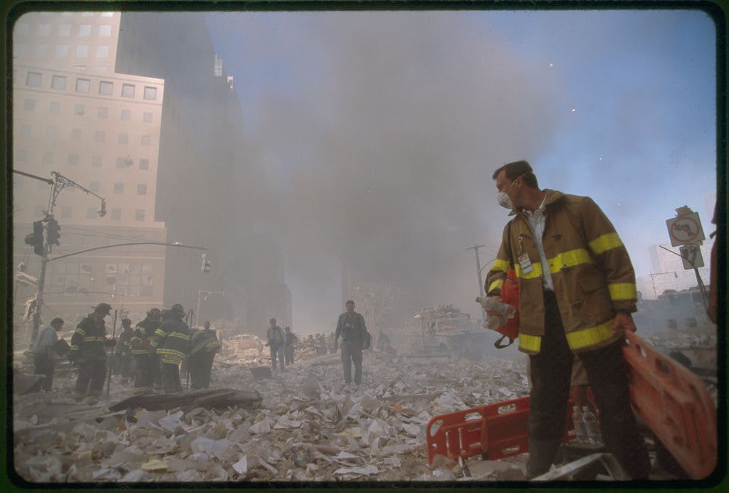 Figure 11. This is a view from West Street, looking east across the remains of WTC1. FEMA entered this photo on 9/13/01, which is the earliest date for any posts for the 9/11 event. Other photos they have for 9/13/01 show much more people and equipment present. So, it is believed that this photo was taken on 9/11/01, but entered into their files on 9/13.. (9/13/01 entered, likely taken on 9/11/01) Source |