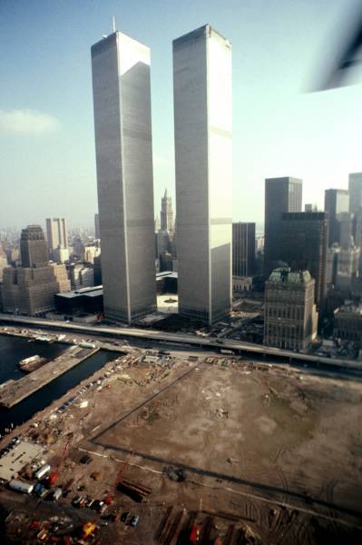 | Figure 12. A view from southwest of the towers, over the Hudson River. WTC6 is the 8-story building just to the left of WTC1, at its base. (pre 9/11/01) Source |
