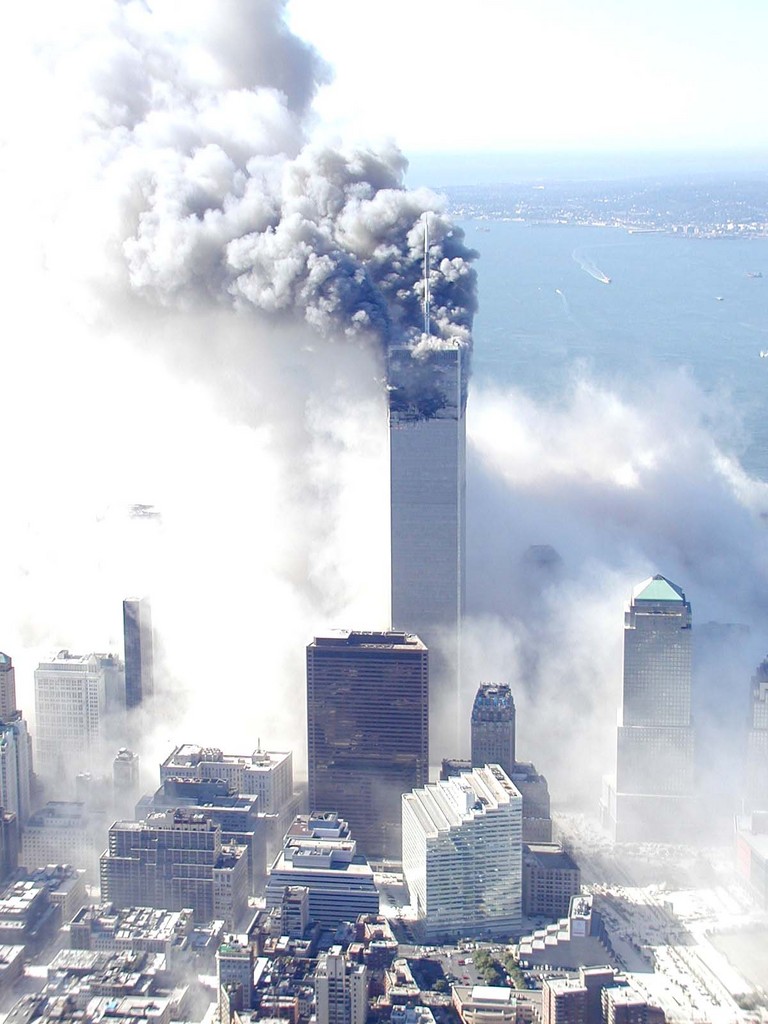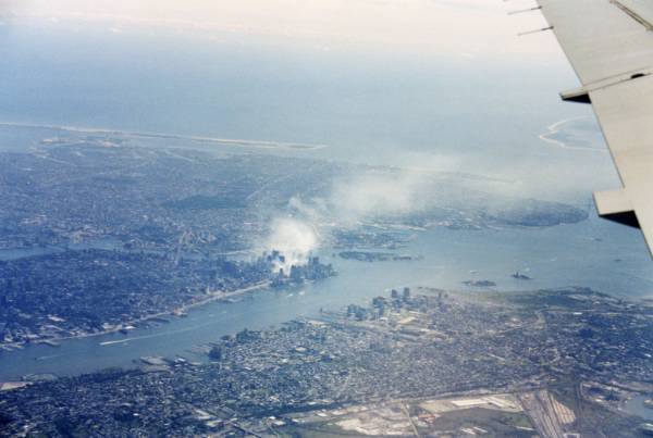 Figure 13. Smoke from the towers blows to the southeast and travels along a fairly horizontal path. It is not blowing up and it is not blowing down. It is blowing out over Brooklyn. (9/11/01 entered) Source |