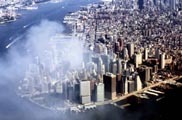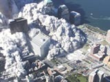 | Figure 14. After the towers are destroyed, the dust cloud rolls along the ground and some of it moves upward. It does not appear to be moving horizontally or downward. The southeast tip of Manhattan is covered in white dust. (9/11/01 entered) Source |