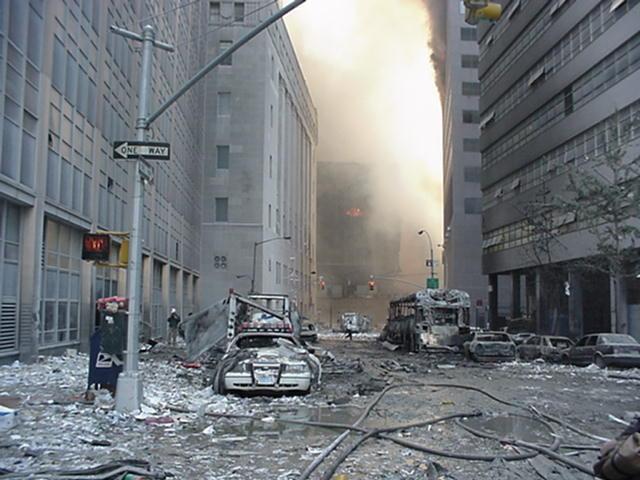 A view west along Vesey street across the West St. intersection. The toasted parking lot is on the right in the distance. This is after WTC1 was destroyed. Sunlight is visible on WFC3 (on left). Paper in the foreground is not on fire. Why are vehicles in the parking lot on fire at some distance away? (9/11/01) Source: |
