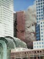 | Figure 31. WTC1 has just been destroyed and the ground-level dust clouds have somewhat cleared the area north (to the left) of the WTC complex. Black smoke can be seen rising from the car lot. Whitish and faint dust clouds can be seen rising from Barclay Street, just behind WTC7. Stronger dust clouds are rising from in front of WTC7 (to the right) along Vesey Street and streets east of the WTC complex. (return to fuming Barclay Street, above) (9/11/01 entered) Source |