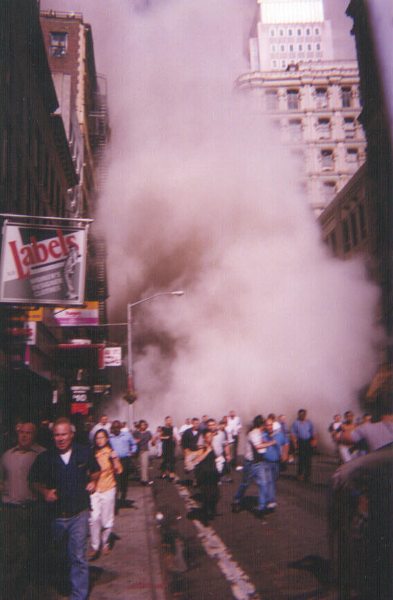 | Figure 38. A view west along Vesey Street. We didn't see or hear of any streets filled with burned bodies. So, I don't believe that cloud is hot. (9/11/01) Source |