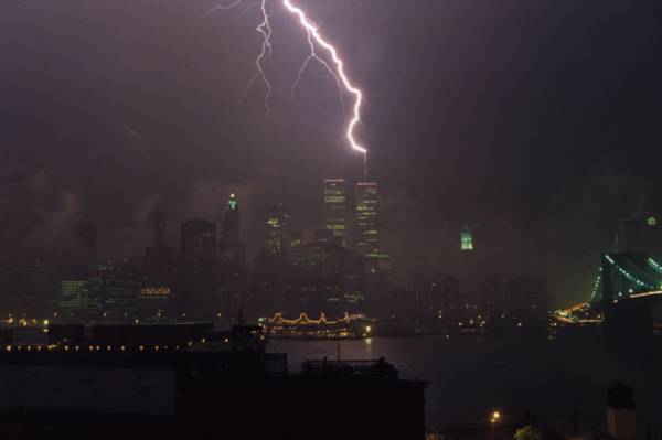 | Figure 50. The antenna on the roof of WTC1 was designed to withstand lightening bolts. (pre 9/11/01) Source |