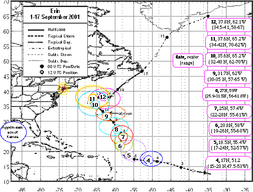 Figure 44: Best track for Hurricane Erin, September 2001. Track during the extratropical stage is based on analyses from the NOAA Marine Prediction Center. The colored circles indicate the approximate area covered by the main body of the hurricane. This shows the potential danger this hurrcane posed on New York and the surrounding area. Map source: |
