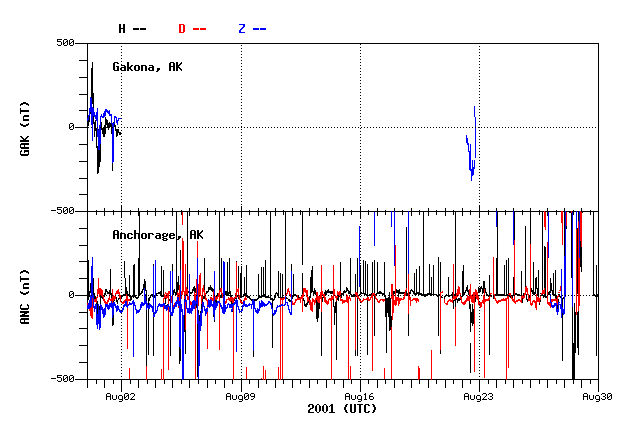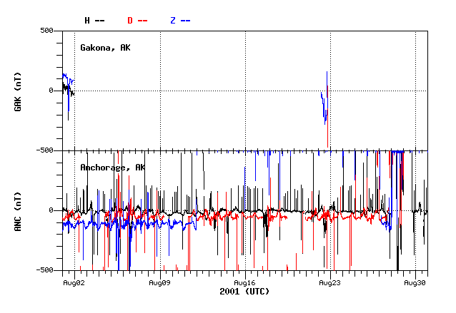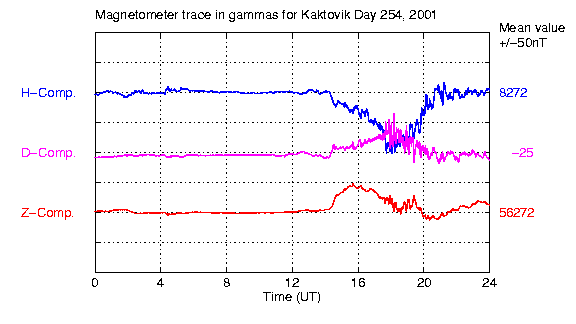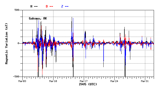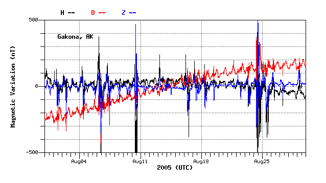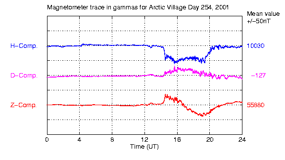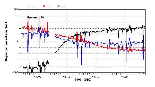 he horizontal scale is always a full 24 hours. The vertical grid is 250 nano-Tesla/grid line. The mean value (in nano-Tesla) printed off the right hand edge of the plot is the average magnetic field strength for that day for each component. The magnetic deviation displayed is computed from that value. The H-component (deviations down indicate the local field has dipped southward) has the greatest deviations in that direction and so is plotted on top. The D-component dips are magnetic west deviations as the magnetometer head is oriented in magnetic coordinates not geographic. The Z component is vertical component. Note: Each component is offset by 2 vertical grid boxes (500 nT) where the component letter indicator off the left and the mean value on the right indicate the zero reference point for each curve. This was done so each component could be identified separately and does not reflect the absolute magnitude of the magnetic field of the component." |