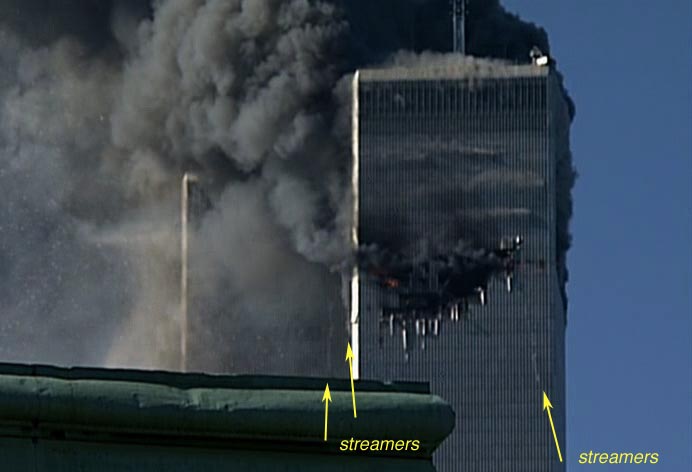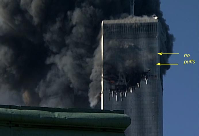 Here's what I think: I believe there were huge explosions, during the time of this video, causing a lot of air pressure to push through the building. Perhaps it is the open windows that allow the venting. But, it's interesting that it doesn't shoot out of the hole where the "plane" went in. So, perhaps the explosions were in many of the floors above the hole, which were to prepare that top chunk to disintegrate, later. My guess is that those people jumped, thinking the building had just blown up. Their only chance for survival would be to jump clear of the exploding building.