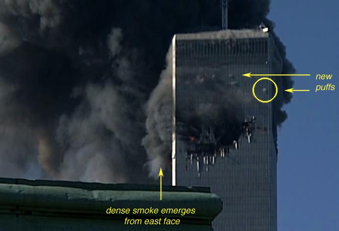 Hey, notice the pigeon flies away *before* the big WTC2 explosion. i.e. The plane hit didn't jar the building much. The explosions shook the building. The plane didn't! I'm assuming the plane hit about the time the bird flew away. The bird would fly, sensing danger. He's going to fly away as the building is hit. Notice he glances over at WTC2, several times, waiting to see if he needs to leave. He sees the plane coming.
