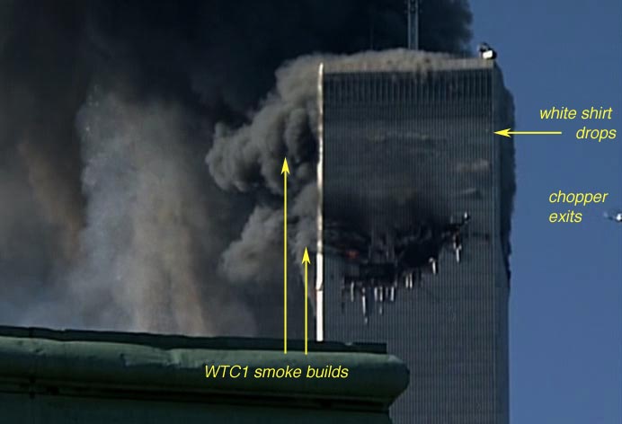 f) Then, a few seconds later, here comes the chopper, flying around the back side of the towers. I think this chopper may have been there to set off these detonations, just as WTC2 was hit. Perhaps they assumed it would be less noticeable. After all, the explosions you heard were of the fuel exploding out of WTC2, right? ...sure...