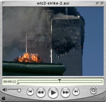 Near the top floor, you see a guy waving a white shirt (at least it looks like this). He's in the upper right corner of the building that's facing the camera, just below the dark area, and just at the top of the uniformly gray part of the building. Just when WTC2 is hit, the pigeon in the foreground flies away. Right at that moment, a bunch of things happen.