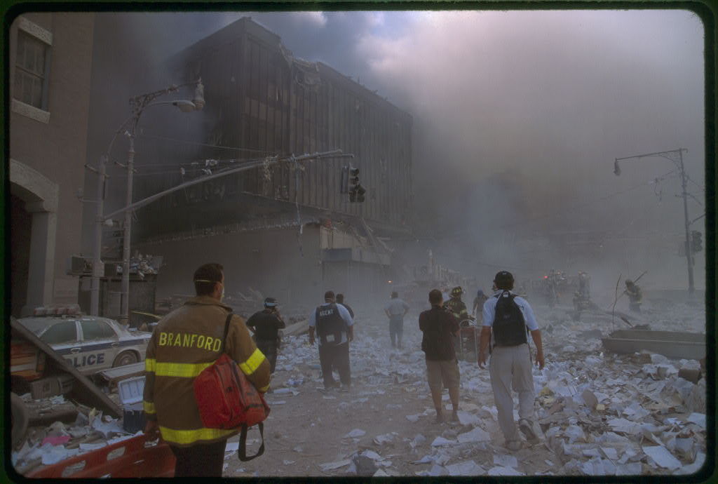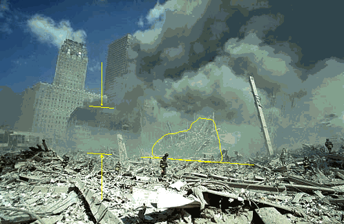 According to Dr. Griffin, the piles for the Twin Towers were 4-6 stories high. The pictures below show that the piles were only 1-2 stories high within hours of the destruction . See the 2nd floor skywalk in the background below. This picture is from mid-day 9/11 (notice WTC7 still standing in background with Building 6 to its left in the foreground). Building 6 is eight stories tall and it towers over the remnants of Tower 1. Recall that the Poseidens forks were the lobby area of the Towers and they stand well above any debris pile as shown in figures 3 and 4. Did they haul the buildings away that day? See for yourself: