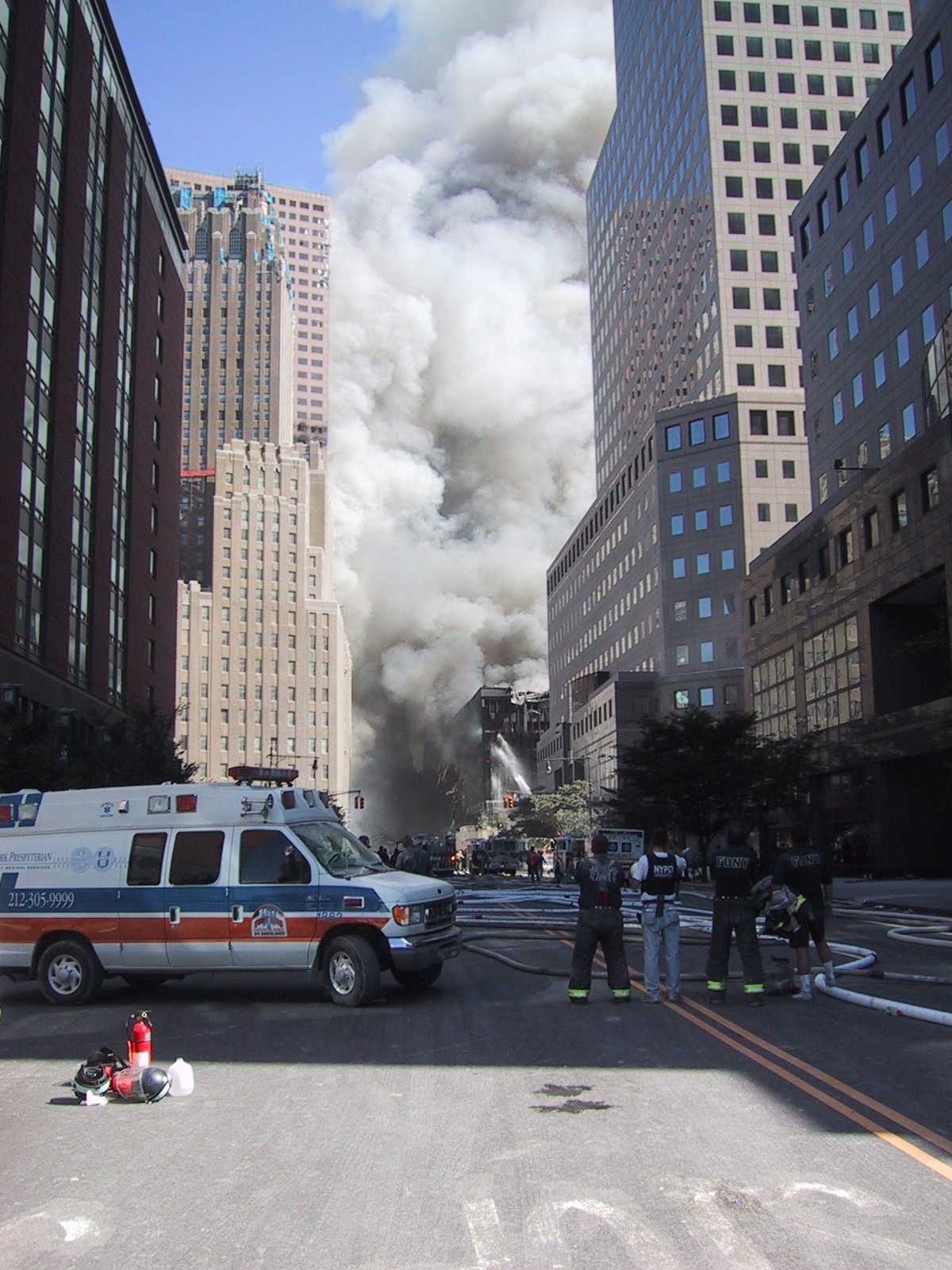 Figure 34. Why is WTC1 lathering up? And why is WTC7 also lathering up? This is Church and Reade, looking southward. It appears that WTC2 was just destroyed as the street is not yet coated with powder. Later photos of this area show a fine whitish dust coating the street.