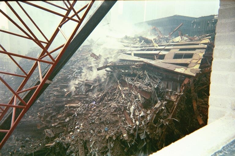 Figure 18. Looking over the WTC7 pile from a window of the Verizon building. Note the dirt. This looks more like a Dagwood Sandwich than a "building collapse."