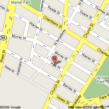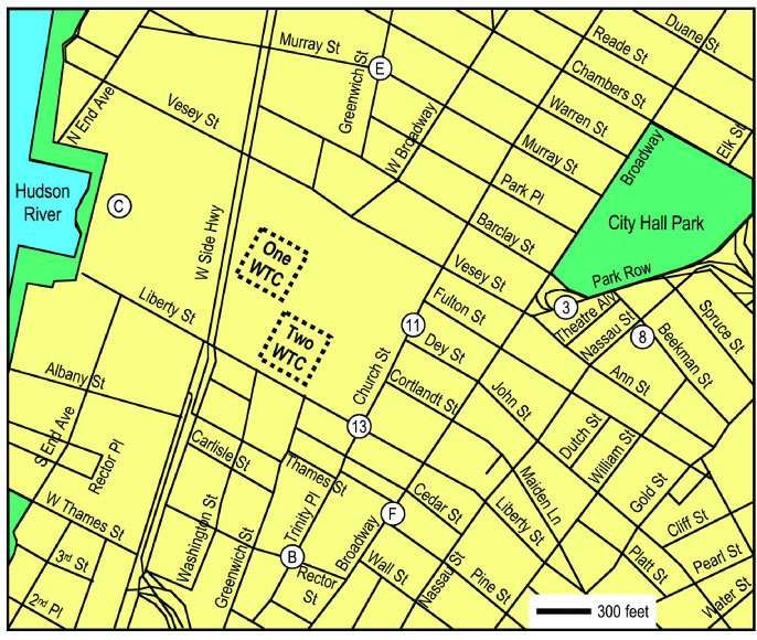 Figure 17. Map with street names and one-way notations. This map appears to reflect the situation after 9/11/01 as it shows Vesey Street closed off.